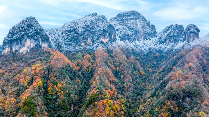 光雾山景区燕子岭初雪和彩林。新华社发(杨建 摄)