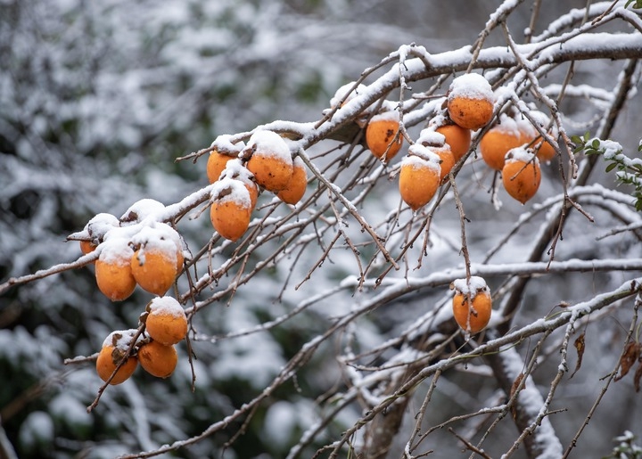 光雾山景区里柿子树披上初雪。新华社发(付海旭 摄)