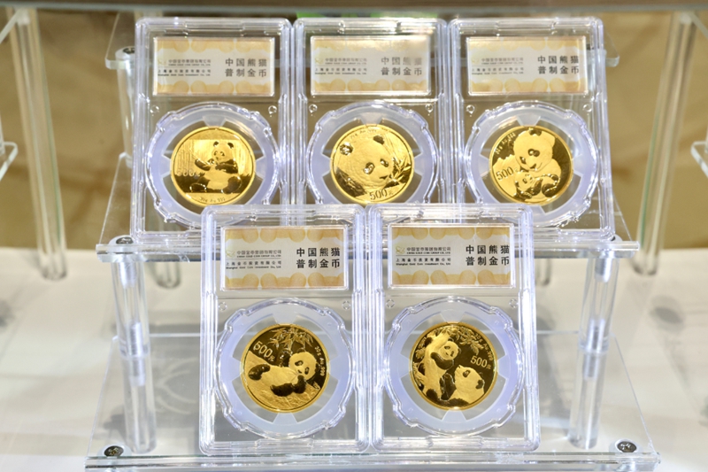 成都空港国际会议中心展区的熊猫金币展品。新华网发(张可凡 摄)