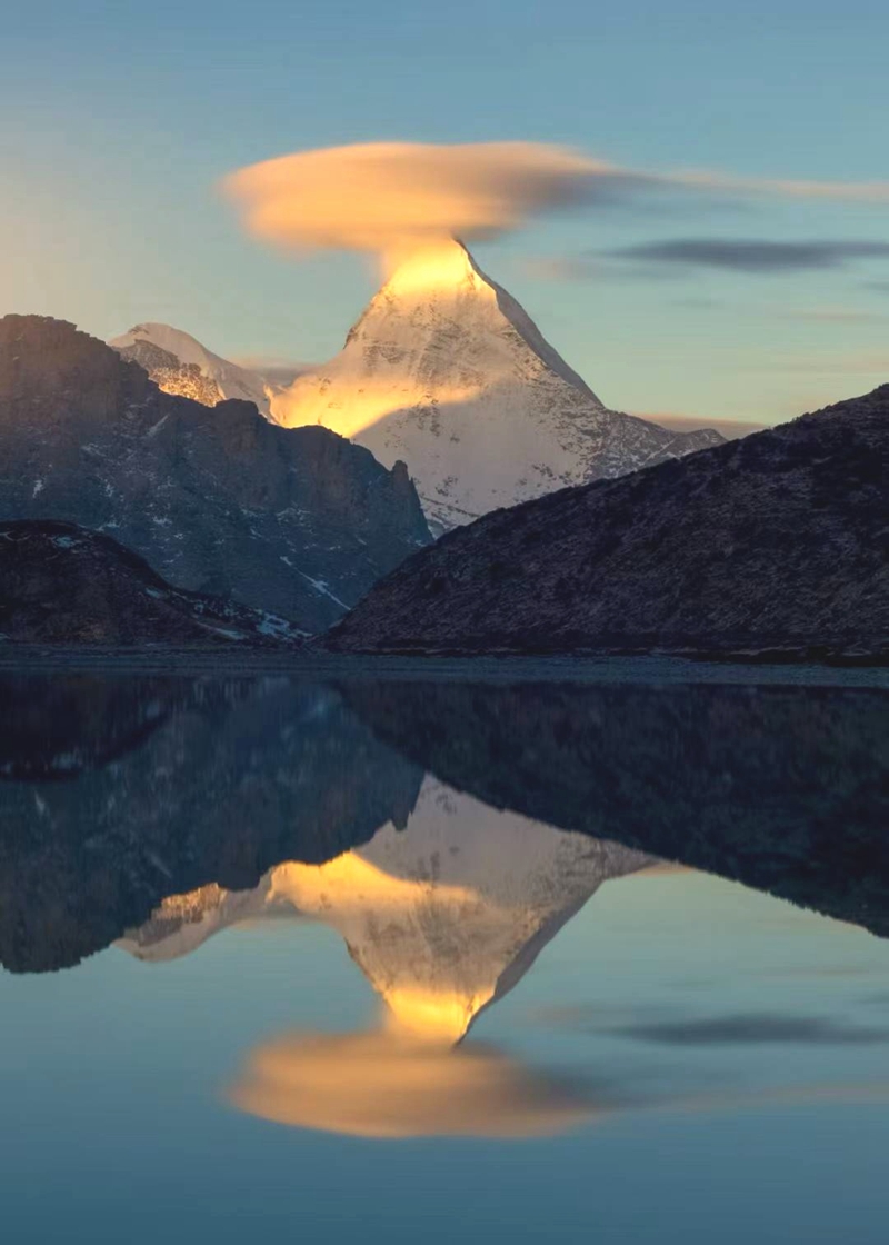 那是一种被极致之美击中的震撼。仙乃日、央迈勇、夏诺多吉——三座分别象征着仁厚、睿智与刚毅的雪山,不必仰望,它们以浑然天成的姿态充盈于天地之间。仙乃日如端坐的尊者,雪幕流转着清辉;央迈勇似持剑的智者,冰肌玉骨映照着通透的灵性;夏诺多吉则是英武的勇士,棱角劈开云雾。阳光为雪冠镀上流金,仿佛仙子的彩衣在云端飘舞。