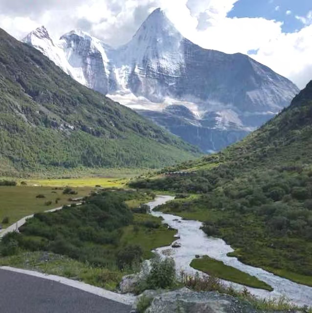 这里的天空蓝得如同精心淬炼的琉璃,纯粹得不容一丝杂尘,仿佛要将观者的心神也融入那无垠的光明之中。而那三座雪山,正从这片蓝缎上巍然耸立,雪峰直指苍穹。