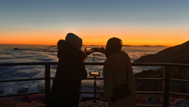 游客在娘娘山弥勒殿观景台迎接日出(2025年3月1日摄)。