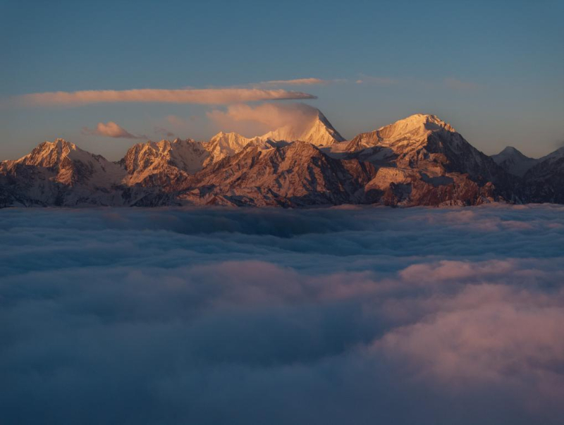 1月1日,从娘娘山远眺日出时分的贡嘎雪山和云海。