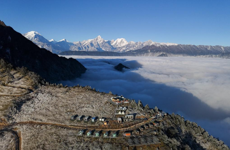 俯瞰云上民宿,远处是云海和贡嘎群峰(2025年12月14日摄)。