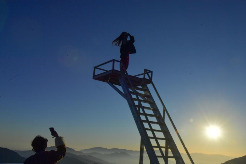 娘娘山半山腰上的云上民宿,游客在网红梯上留影打卡(2025年12月18日摄)。