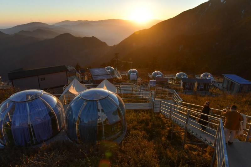几位游客在云上民宿的星空房里远眺群山(2025年12月18日摄)。
