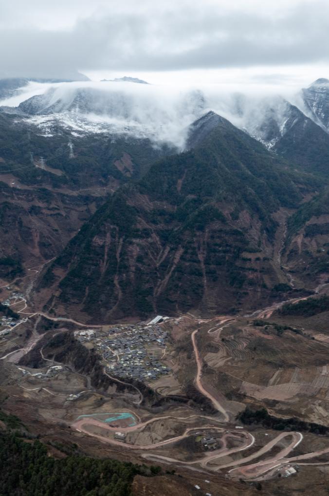 云瀑下的泸定县兴隆镇化林村(1月1日摄)。