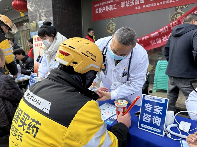 义诊专区里,医护人员为新就业群体测量血压、检测血糖等。(九江街道 供图)