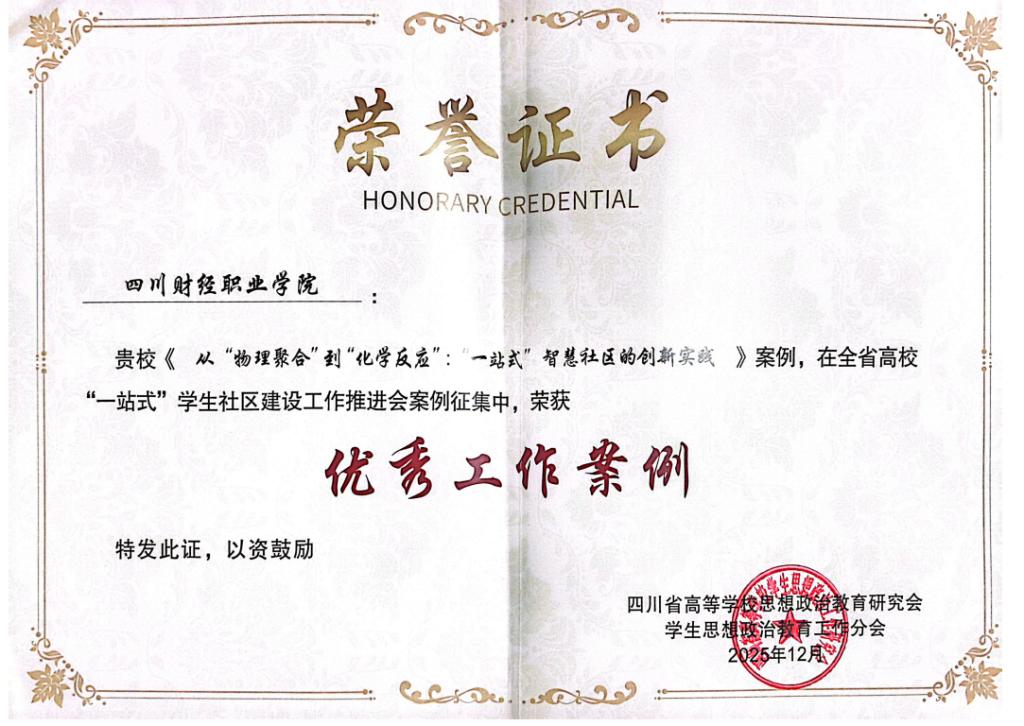 会议同期公布了全省高校“一站式”学生社区建设优秀工作案例名单。四川财经职业学院报送的《从“物理聚合”到“化学反应”:“一站式”智慧社区的创新实践》案例,凭借鲜明的财经特色、创新的育人模式和显著的建设成效,在众多参评案例中脱颖而出,获评全省“优秀工作案例”奖。