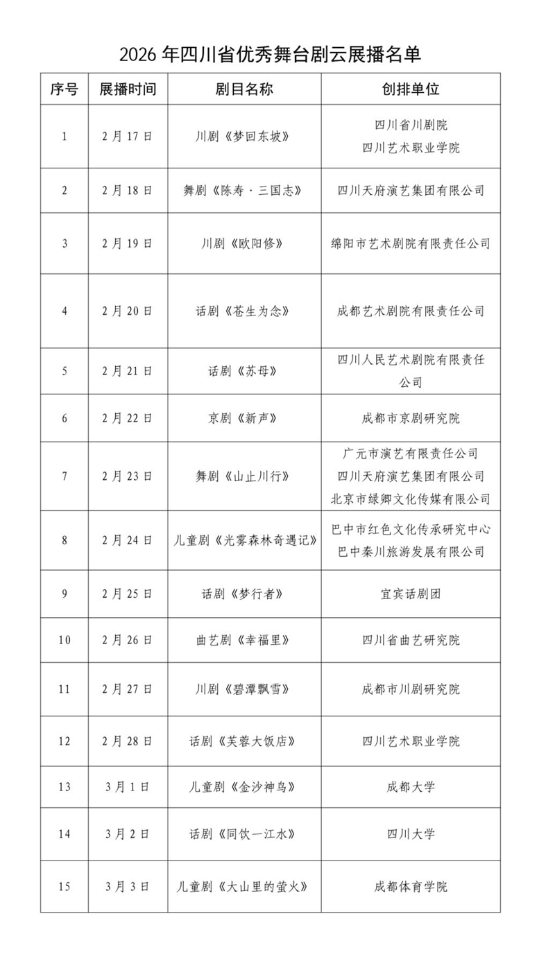 新春临近,四川省艺术创作促进中心(四川省艺术基金中心)将于2026年2月17日至3月3日期间,开展2026年四川省优秀舞台剧目云展播活动,15部精品剧目将以“云端”形式呈现。