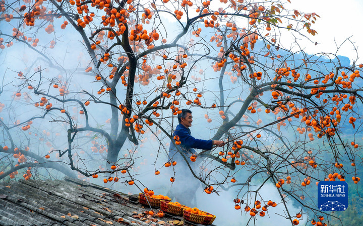 11月27日,四川省泸州市江阳区泰安街道咀阳村村民在采摘柿子。新华社发(刘学懿 摄)
