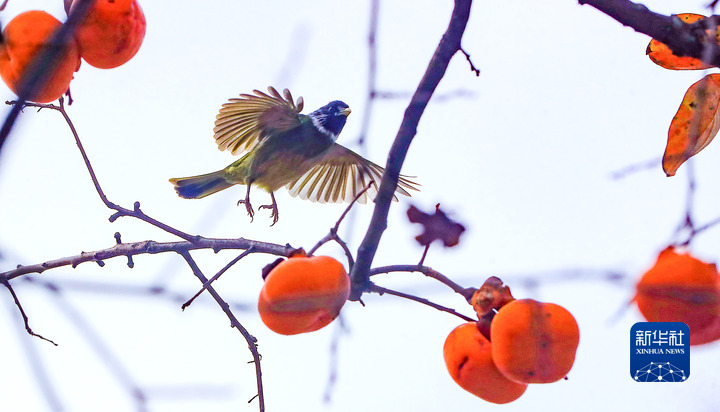 11月27日,在四川省泸州市江阳区泰安街道咀阳村,鸟儿在柿子树上觅食。新华社发(刘学懿 摄)