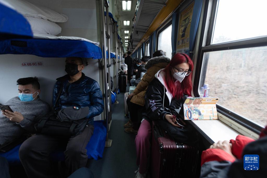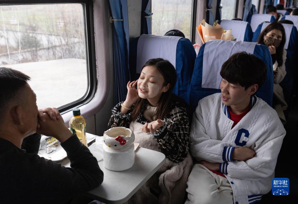 2月14日,在临客K4618次列车上,一名女乘客在敷面膜。新华社记者 江宏景 摄
