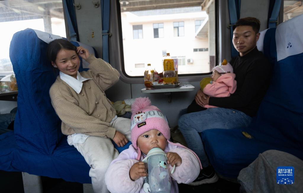 2月13日,在临客K4618次列车上,来自四川省德昌县的夫妇带着两个孩子外出务工。新华社记者 江宏景 摄