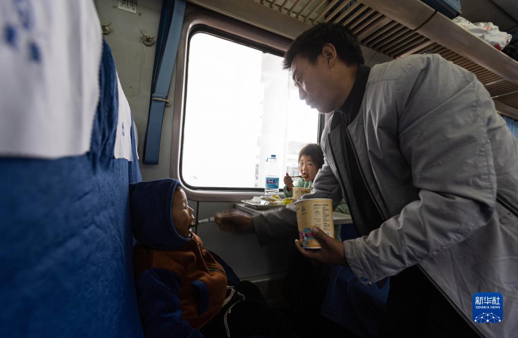 2月14日,在临客K4618次列车上,一位父亲照顾孩子吃饭。新华社记者 江宏景 摄