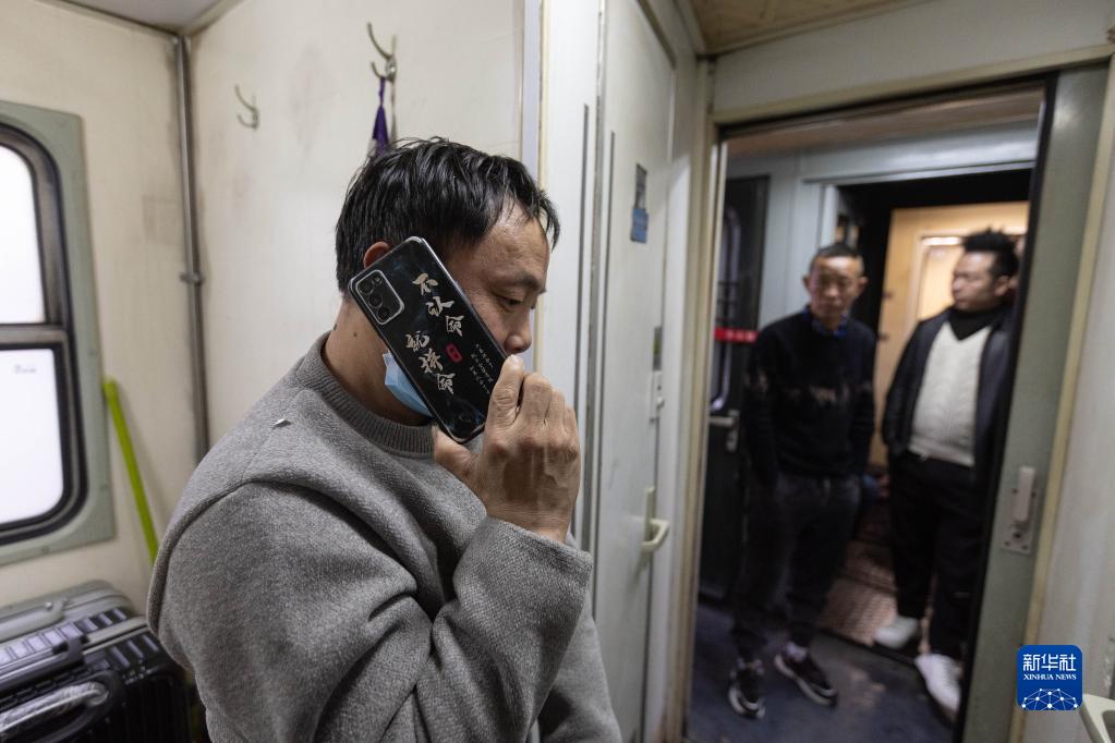 2月14日,在临客K4618次列车上,一名乘客在打电话。新华社记者 江宏景 摄