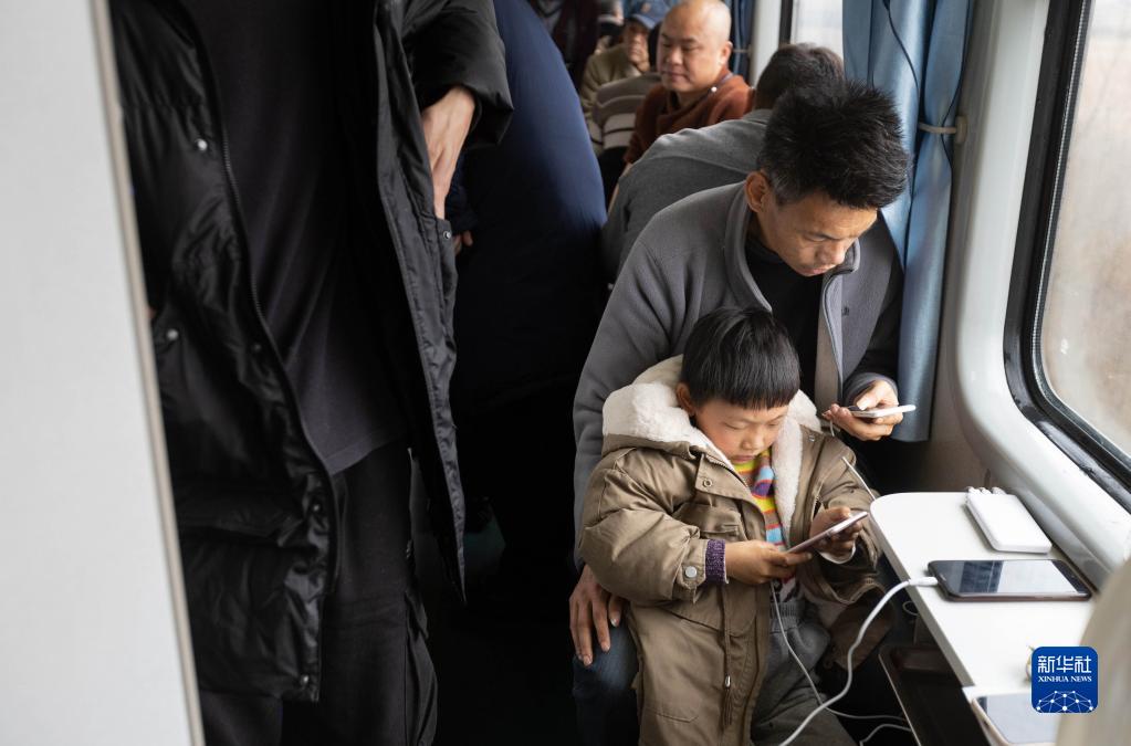 2月14日,在临客K4618次列车上,一对父子在看手机。新华社记者 江宏景 摄