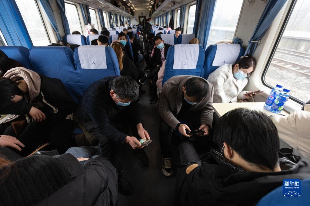 2月14日,在临客K4618次列车上,几名乘客在硬座车厢看手机。新华社记者 江宏景 摄