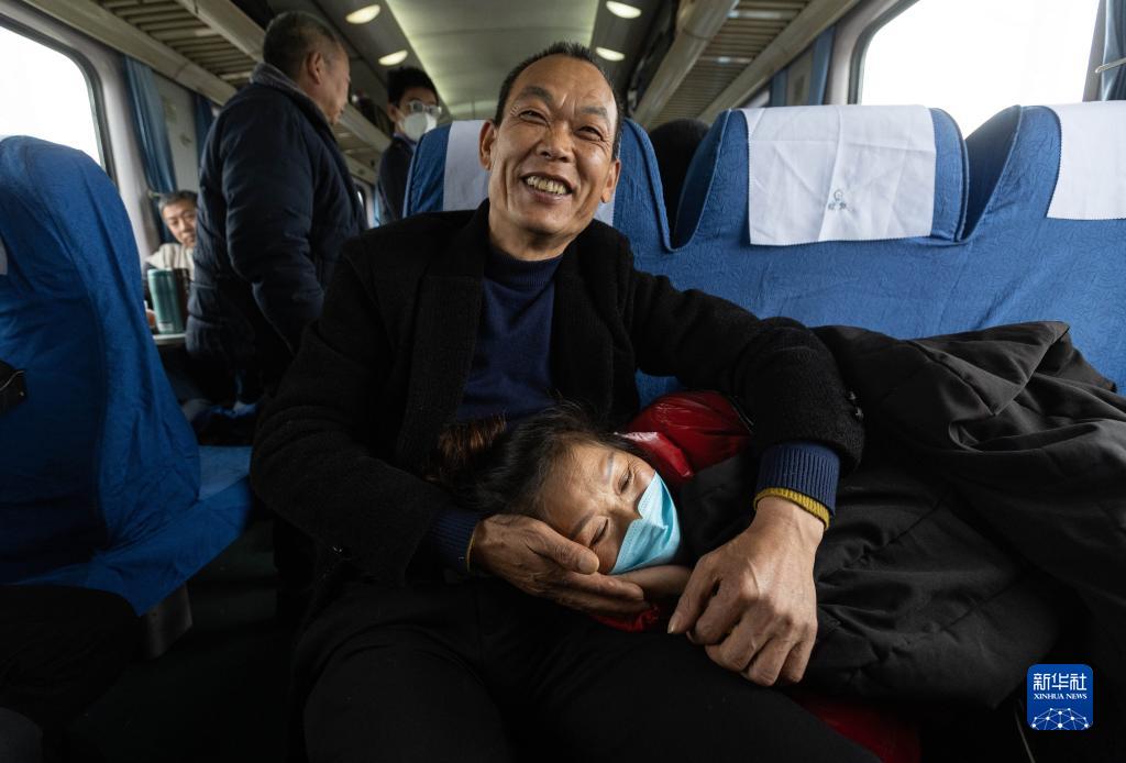 2月14日,来自四川省眉山市彭山区的舒纪林夫妇在临客K4618次列车上。新华社记者 江宏景 摄