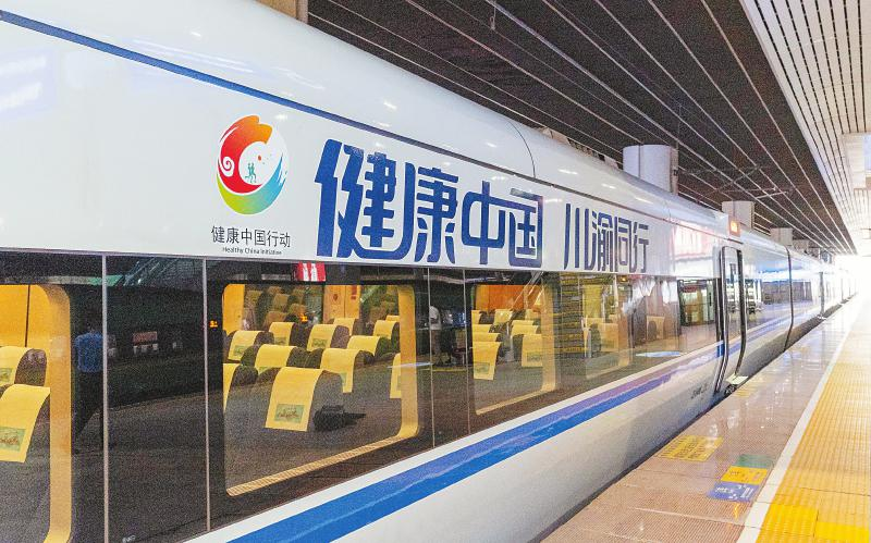 停靠在成都东站站台的“健康中国川渝号”主题动车。记者 黄潇 摄