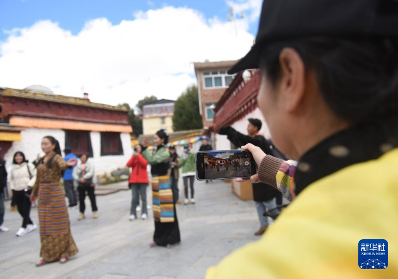10月10日,游客在理塘县勒通古镇拍摄锅庄舞。新华社记者 黄晓勇 摄