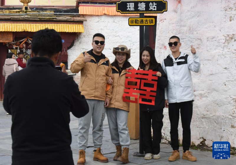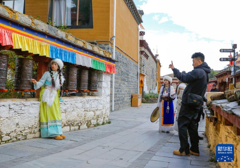 10月10日,游客在理塘县勒通古镇拍藏族风情写真。新华社记者 沈伯韩 摄