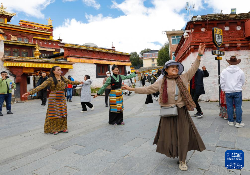 10月10日,游客(前)在理塘县勒通古镇跟着当地藏族群众跳锅庄舞。新华社记者 沈伯韩 摄