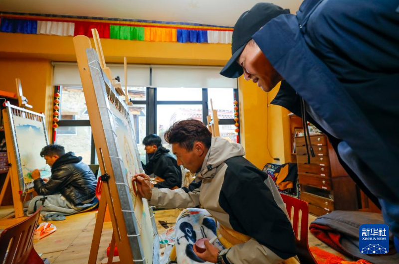 10月10日,游客(右)在理塘县勒通古镇的“唐卡馆”观看当地艺术家创作唐卡作品。新华社记者 沈伯韩 摄