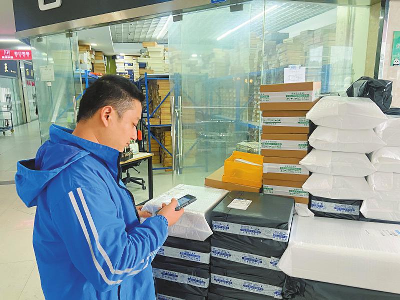 成都国际美博城内,快递员陈龙正在联系客户。记者 文露敏 陈俊伶 摄