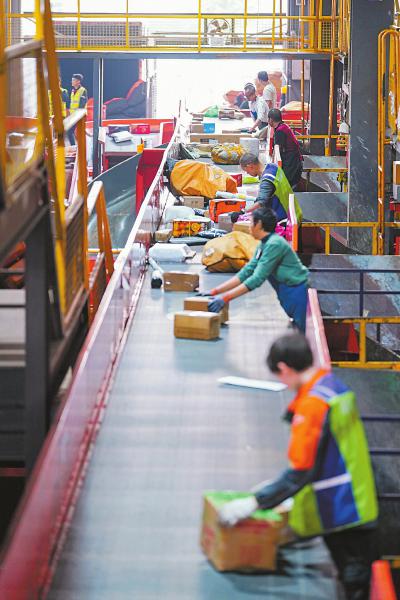 11月7日,位于成都双流区的圆通速递成都集运中心,工作人员正有序地将快递搬运、分拣、扫码,力争以最快速度将包裹运送到消费者手中。刘婷 摄