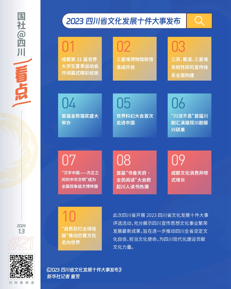 新华社成都1月3日电(记者童芳)1月2日,2023四川省文化发展十件大事在成都发布,三星堆博物馆新馆落成开放等获评。