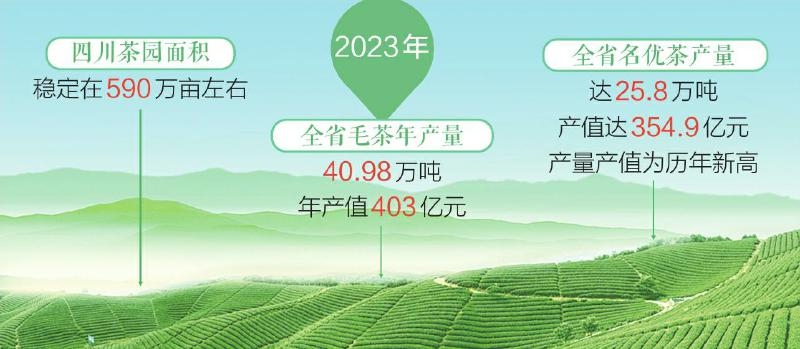 2023年,四川茶园面积稳定在590万亩左右。得益于全省茶叶呈现出开采早、产量增的良好态势,带动茶叶价格、产值提升。全年全省毛茶年产量40.98万吨、年产值403亿元,同比分别增长4.32%、10.41%。