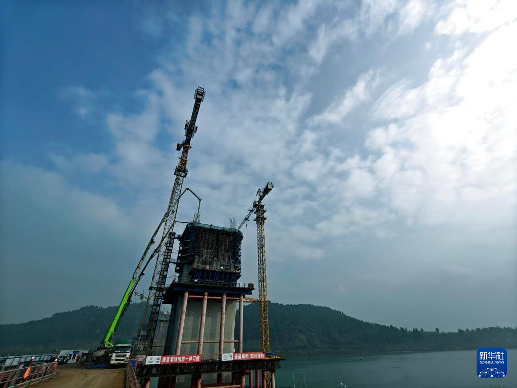 施工中的成达万高铁南充嘉陵江特大桥主塔和主梁。新华社记者谢佼 摄