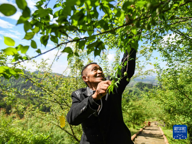 4月3日,在四川省达州市达川区百节镇,种植户在疏果。新华社记者 王曦 摄