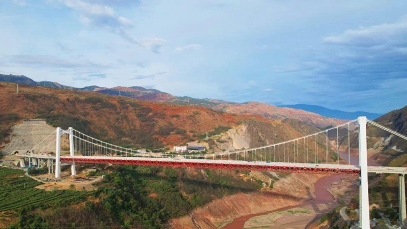 据介绍,本次通车段有2处控制性工程,分别是钒钛高新区大桥和黑水河特大桥。钒钛高新区大桥起于攀枝花市盐边县红格镇,止于攀枝花市仁和区,全长3.535公里,主桥为跨径128+245+128米的预应力砼矮塔斜拉桥,引桥为T型简支梁桥、连续钢桁——混凝土叠合梁。黑水河特大桥位于凉山州宁南县宁远镇境内,大桥设计桥跨布置为5×40米+550米+3×38.5米,其中边跨为预应力T梁,主跨主梁为550米钢桁梁,桥面板为正交异性钢桥面板,主塔设两道横梁。