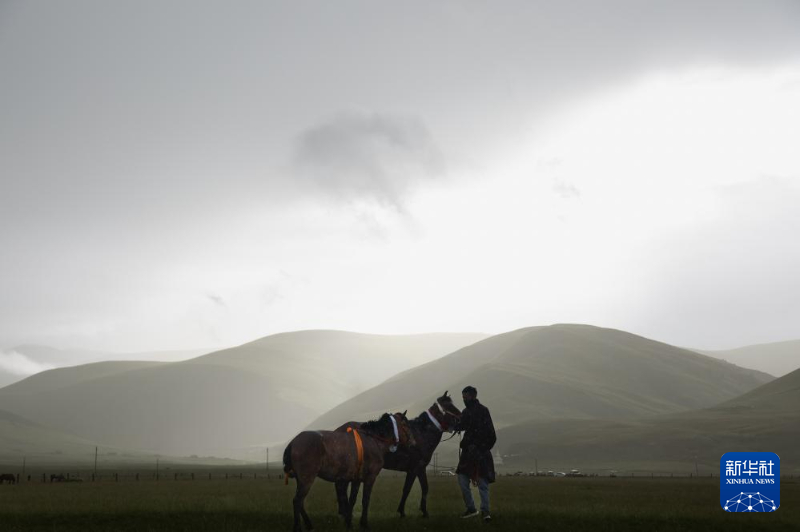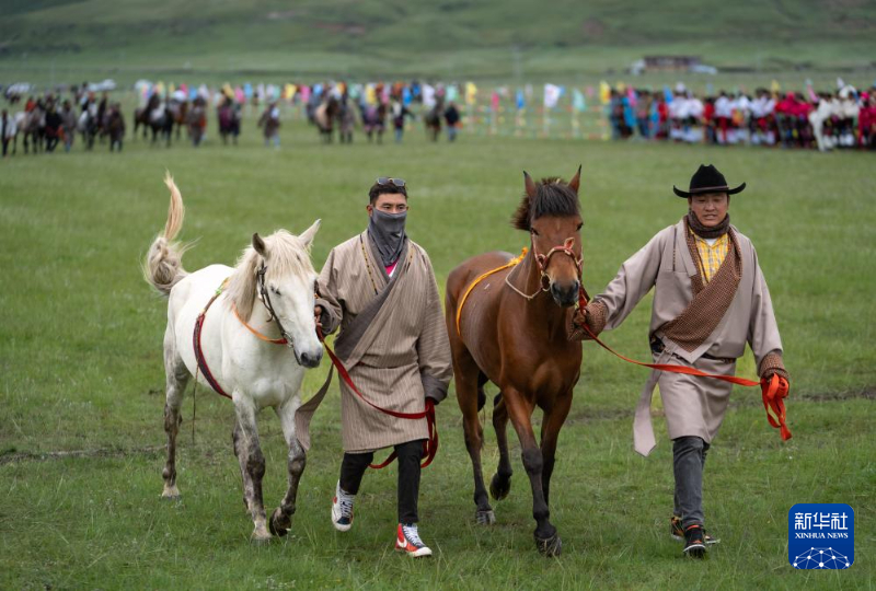 7月27日,两名藏族群众牵着马走进赛场。新华社记者 江宏景 摄