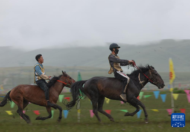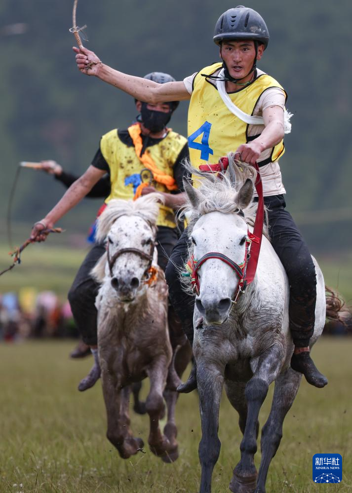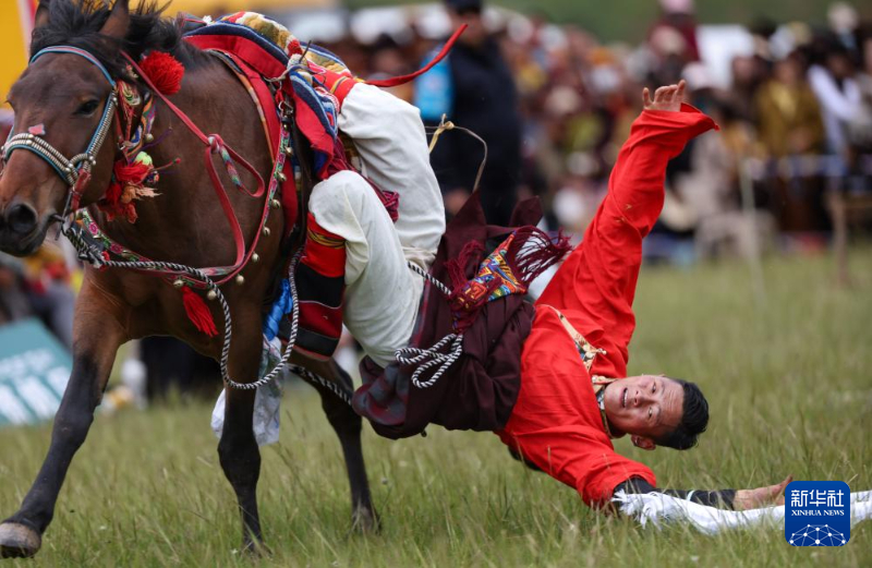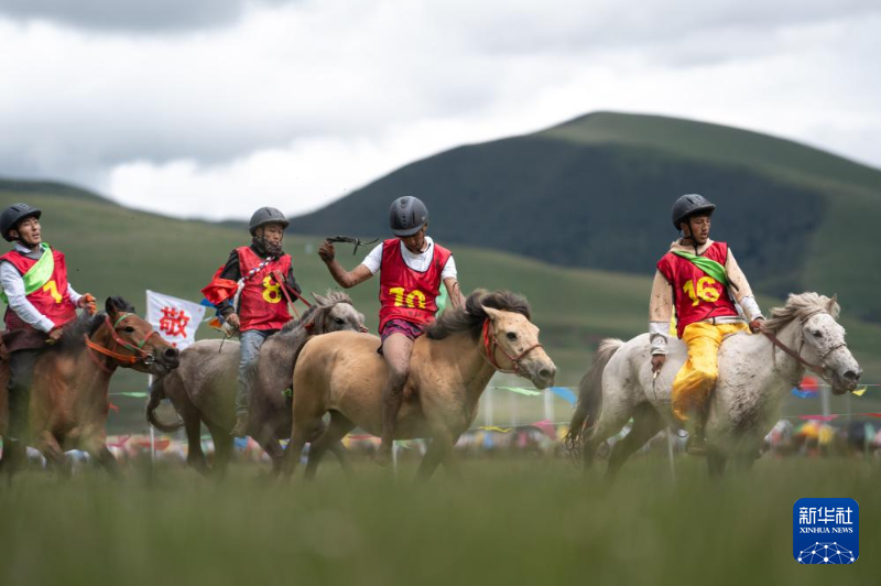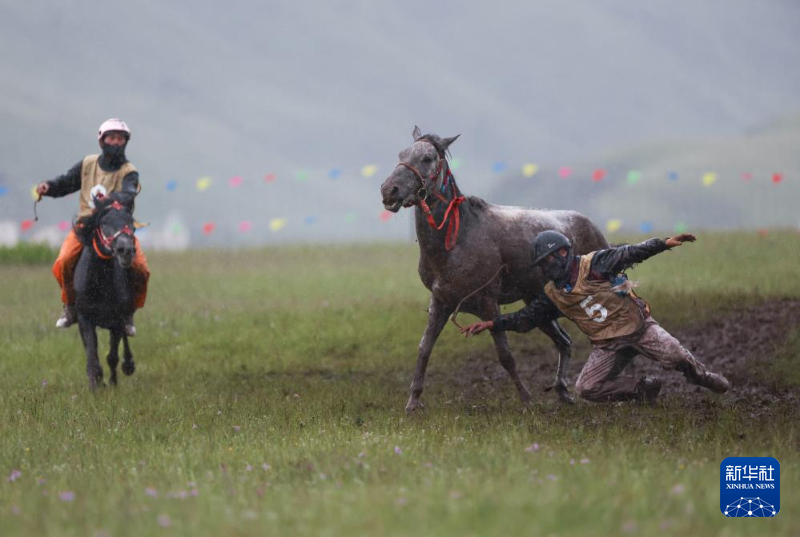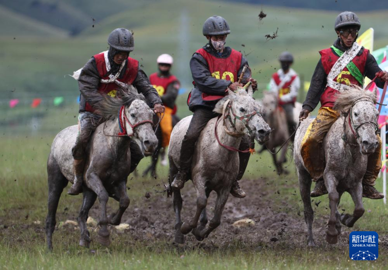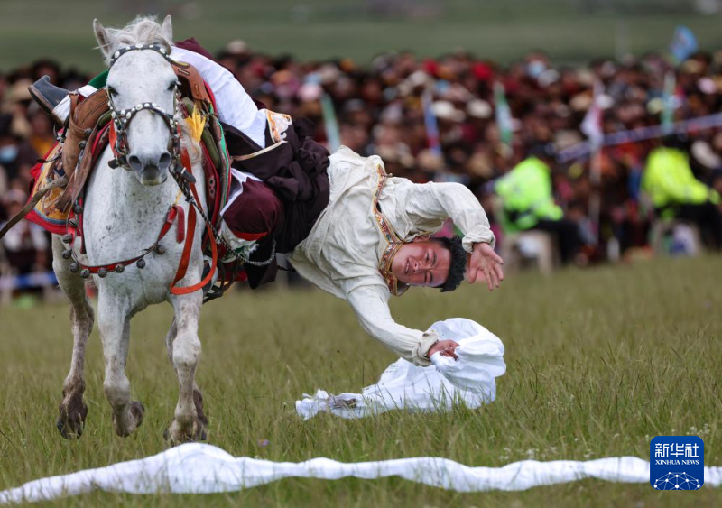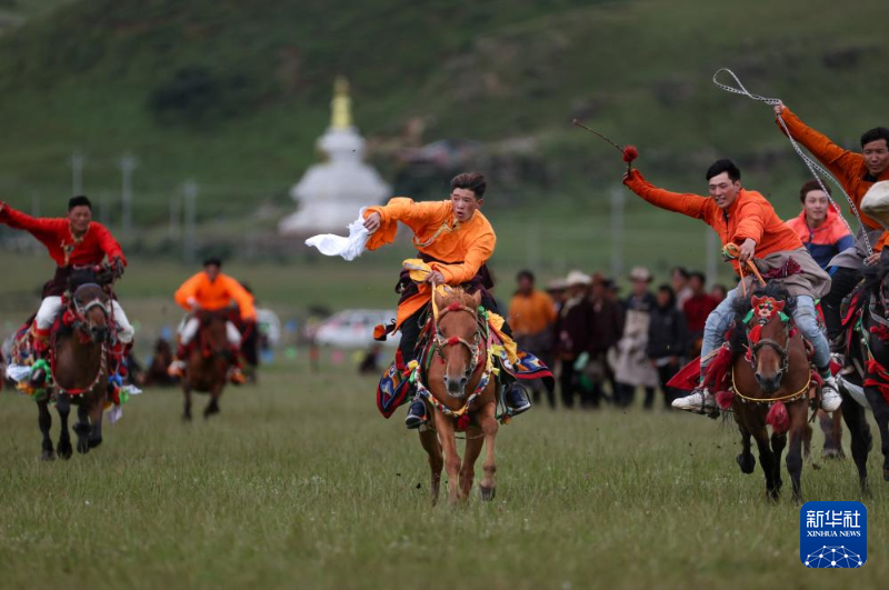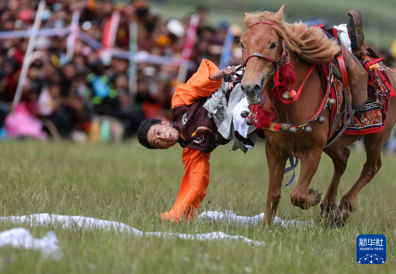 7月28日,当地群众在参加骑马拾哈达比赛。新华社记者 江宏景 摄