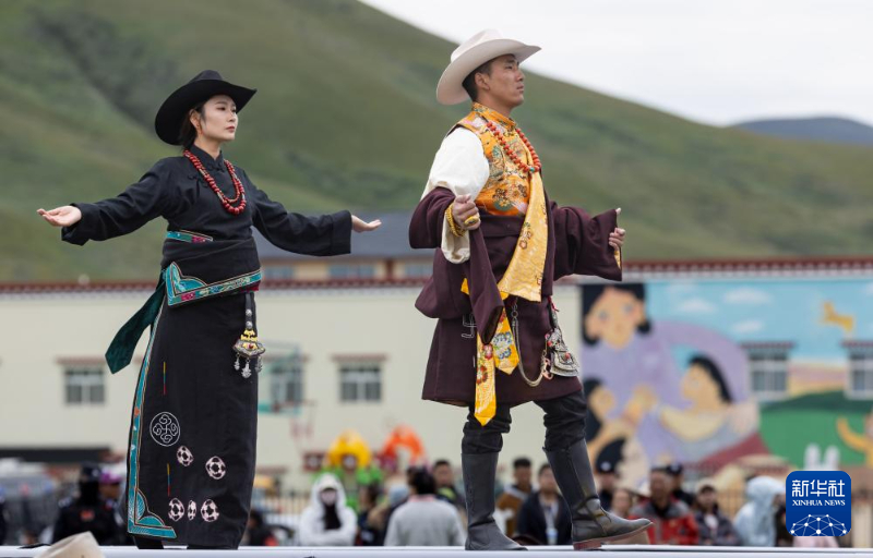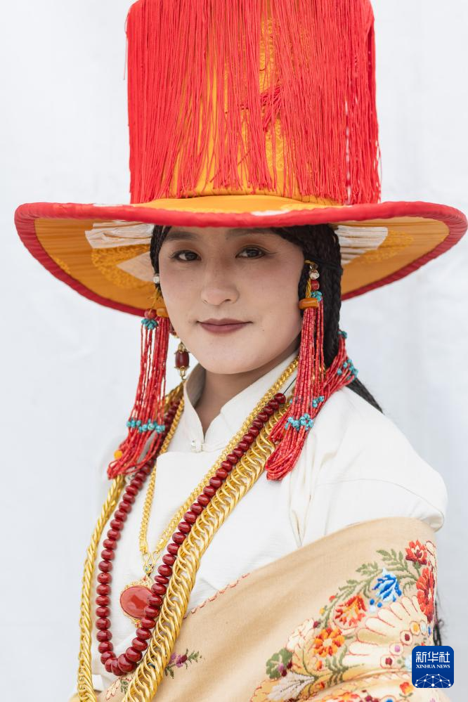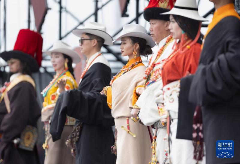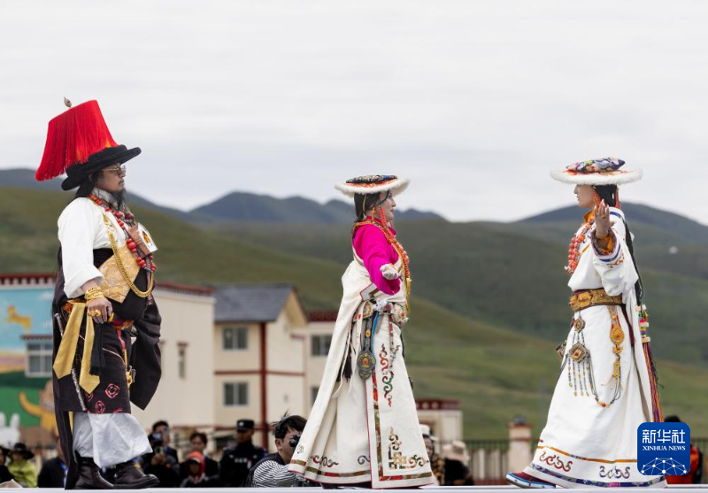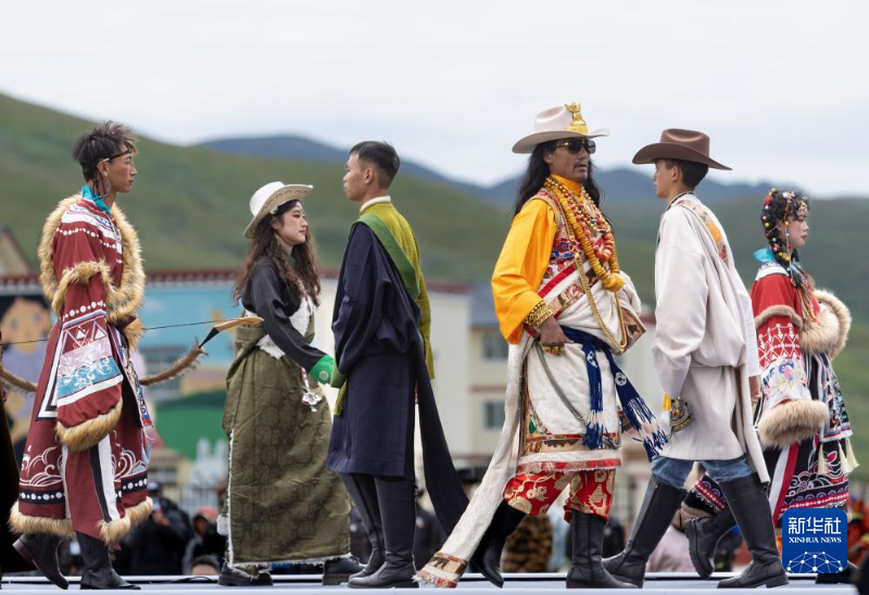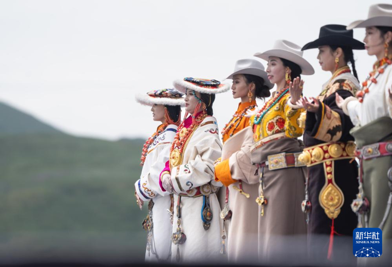 8月10日,在四川省色达县,当地藏族群众穿着藏族服饰进行展示。新华社记者 江宏景 摄