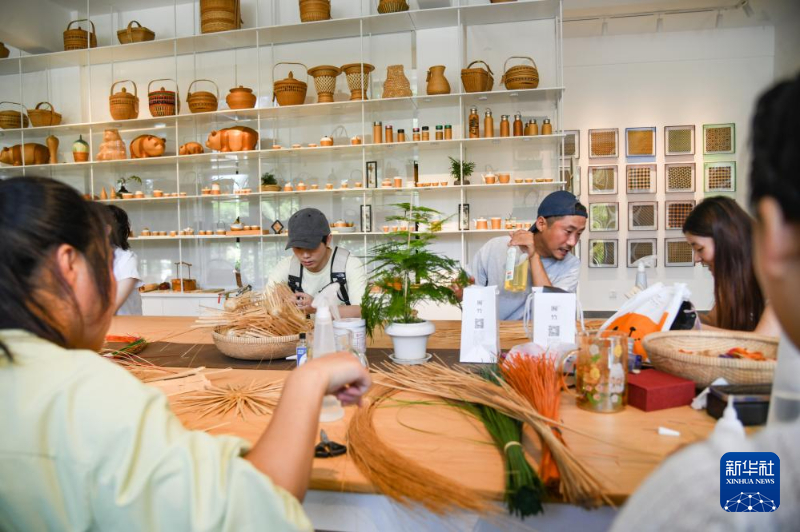 8月12日,在四川省崇州市竹艺村,游客在体验非遗竹编技艺。新华社记者 王曦 摄