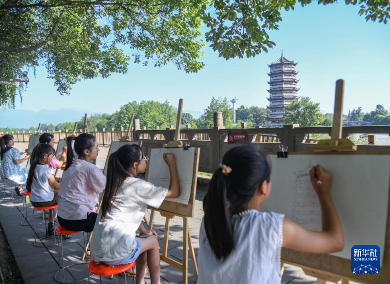 8月13日,在四川省崇州市元通古镇,几位小朋友在写生。新华社记者 王曦 摄