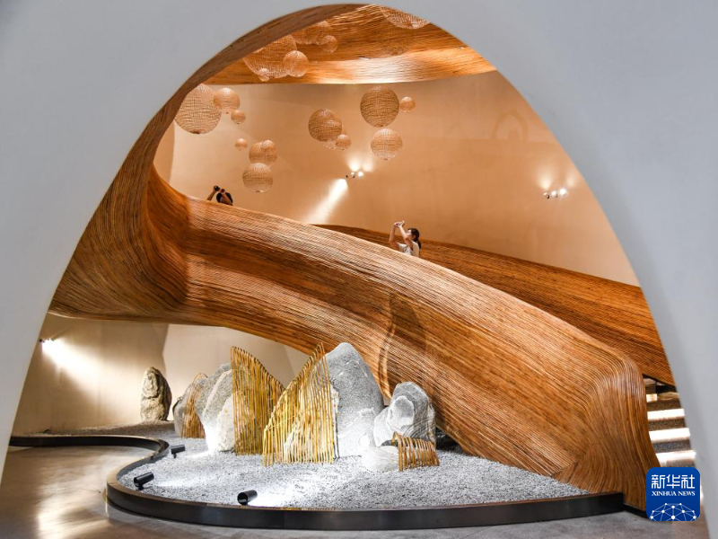 8月12日,在四川省崇州市竹艺公园,游客在竹艺术装置上拍照打卡。新华社记者 王曦 摄