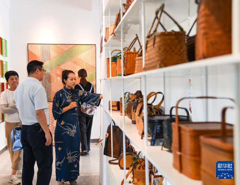 8月12日,在四川省崇州市竹艺村,道明竹编传承人杨隆梅(右二)在向游客介绍产品中使用的非遗技艺。新华社记者 王曦 摄