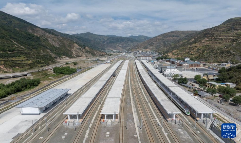 一辆调试列车停靠在川青铁路松潘站(8月29日摄)。新华社记者 江宏景摄