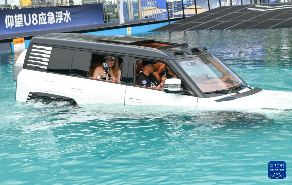 8月30日,在第二十七届成都国际汽车展览会室外汽车技术展示区,参观者在仰望U8应急浮水测试中拍摄。新华社记者 唐文豪 摄
