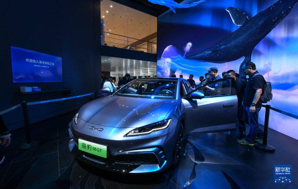8月30日,在第二十七届成都国际汽车展览会比亚迪展馆,参观者在了解新发布的比亚迪海豹06GT。新华社记者 唐文豪 摄