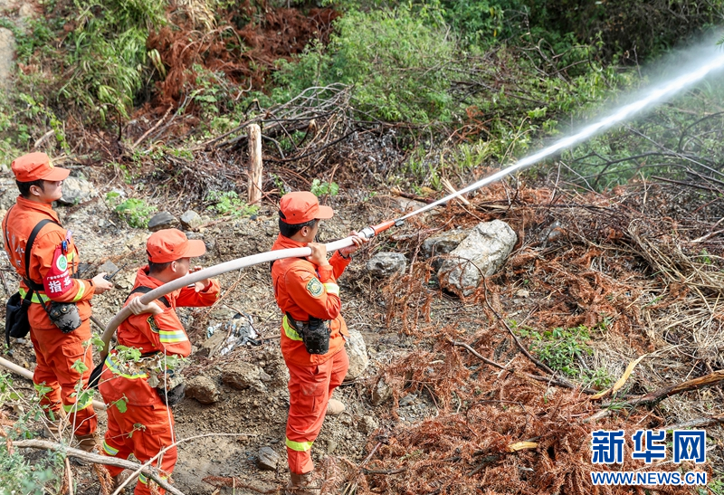 9月2日,四川省广安华蓥市在林区巡护的森林专业扑火队给易燃的枯枝落叶增湿,防患于未“燃”。