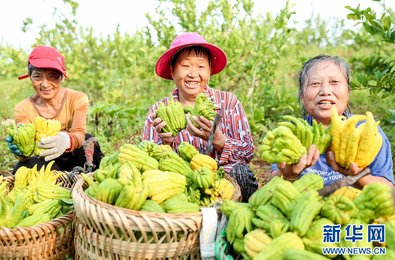9月11日,四川省华蓥市庆华镇铜鼓寨村的村民在中药材基地集中装运刚采摘的佛手。新华网发(邱海鹰 摄)