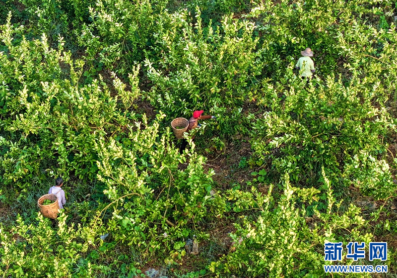 9月11日,四川省华蓥市庆华镇铜鼓寨村的村民在中药材基地采摘佛手(无人机照片)。新华网发(邱海鹰 摄)