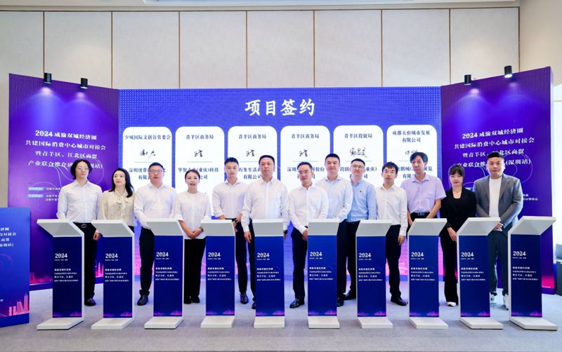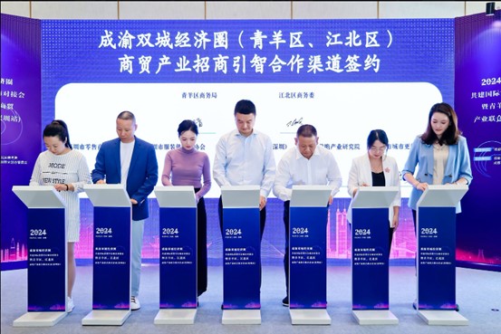 在成渝地区双城经济圈(青羊区、江北区)商贸产业招商引智合作渠道签约环节,青羊区商务局和江北区商务委分别与深圳前瞻产业研究院、中购联品牌合作中心、深圳市服装供应链协会、深圳市城市更新协会、深圳市零售商业行业协会进行合作签约。