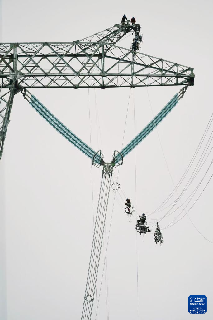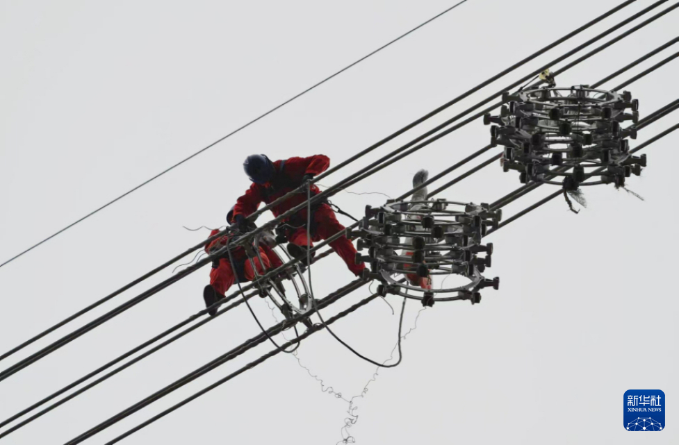 在川渝1000千伏特高压交流输电工程建设现场,电力工人在展放好的导线上,逐一安装间隔棒(10月25日摄)。新华社记者 卢宥伊 摄